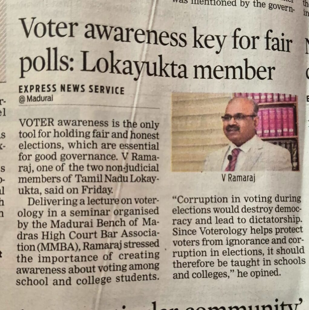Note: The term “Voterology” (வாக்காளரியல் in Tamil) was coined by Dr.V.Ramaraj and it made its debut in his book named “Respectable Voter” in 1996 and an article of Dinamani, a Tamil daily on August 20, 1999. Voterologism is a newly coined word by Dr. V.Ramaraj, derived from “voterology”. Voterologism is used to refer to the doctrines of voterology (school of thought advanced by Dr. V. Ramaraj), that prioritizes the actions, will, or opinions of the voters above all else. Dr. V. Ramaraj is recognized as the “Father of Voterology” for his contributions to understanding voter dynamics and promoting voter awareness.